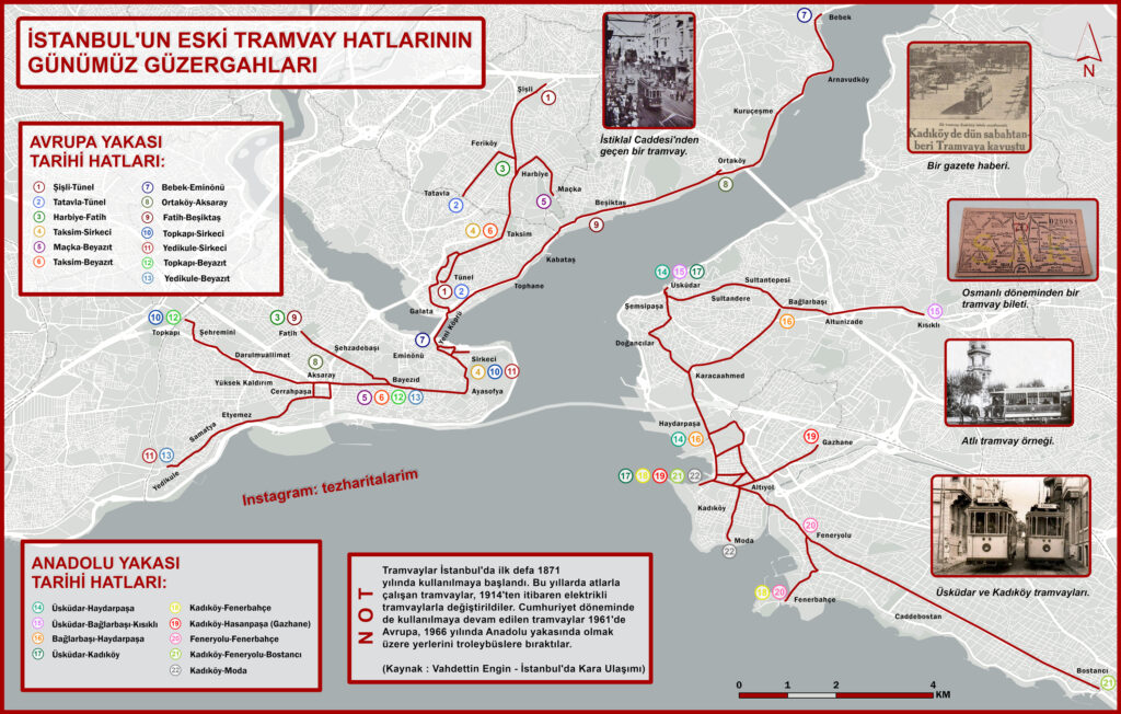 1871’den 1966’ya kadar İstanbul’un tarihi tramvay hatları. Haritada şimdiye kadar tespit edebildiğim tüm tramvay rotalarına yer verdim. Günümüze göre kullandıkları rotaları çıkarttım. Başlangıç ve bitiş noktalarını numaralandırıp renklendirdim. İlgili kişilere yararlı olması dileğiyle.
