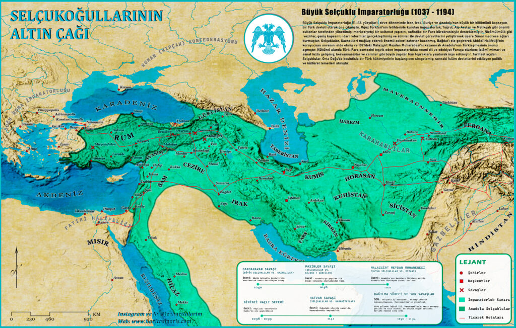 Nasıl Oluşturdum: ArcGIS kütüphanesinden elde ettiğim batimetri, hillshade ve parşömen efekti verileri ile altlığı oluşturdum. Üzerine fiziki coğrafya özelliklerine göre tahmini bir Büyük Selçuklu dönemi sınırı, dönemin şehirleri ve ticaret yolları gibi katmanlar ekleyerek haritayı zenginleştirdim.