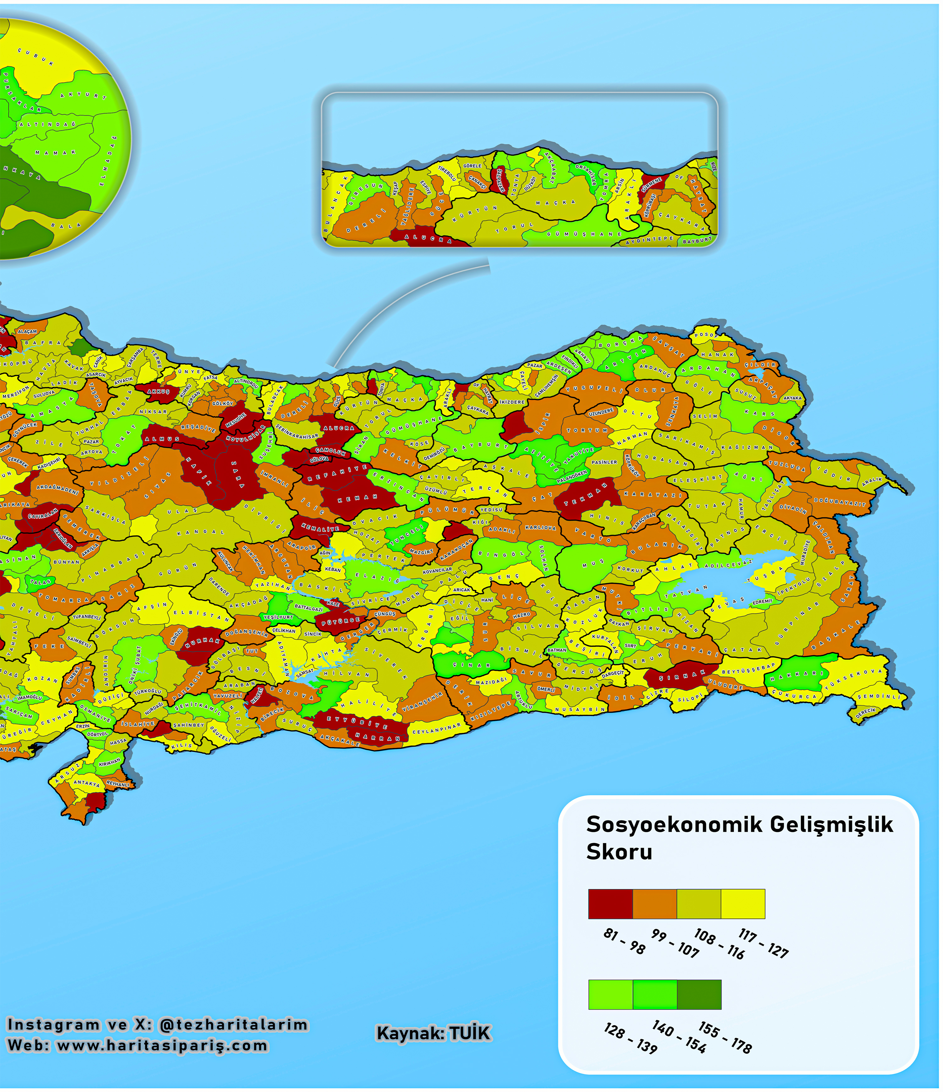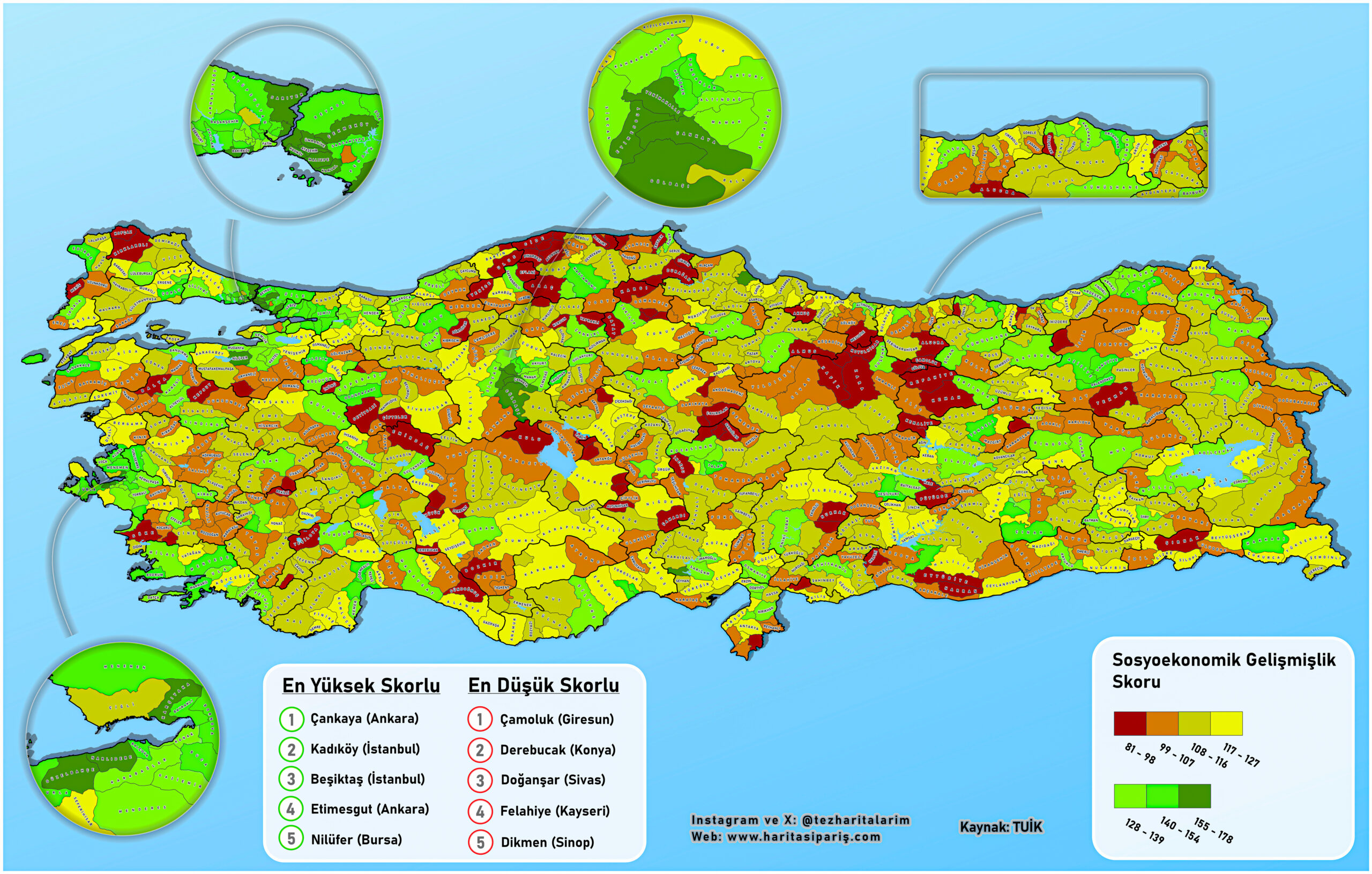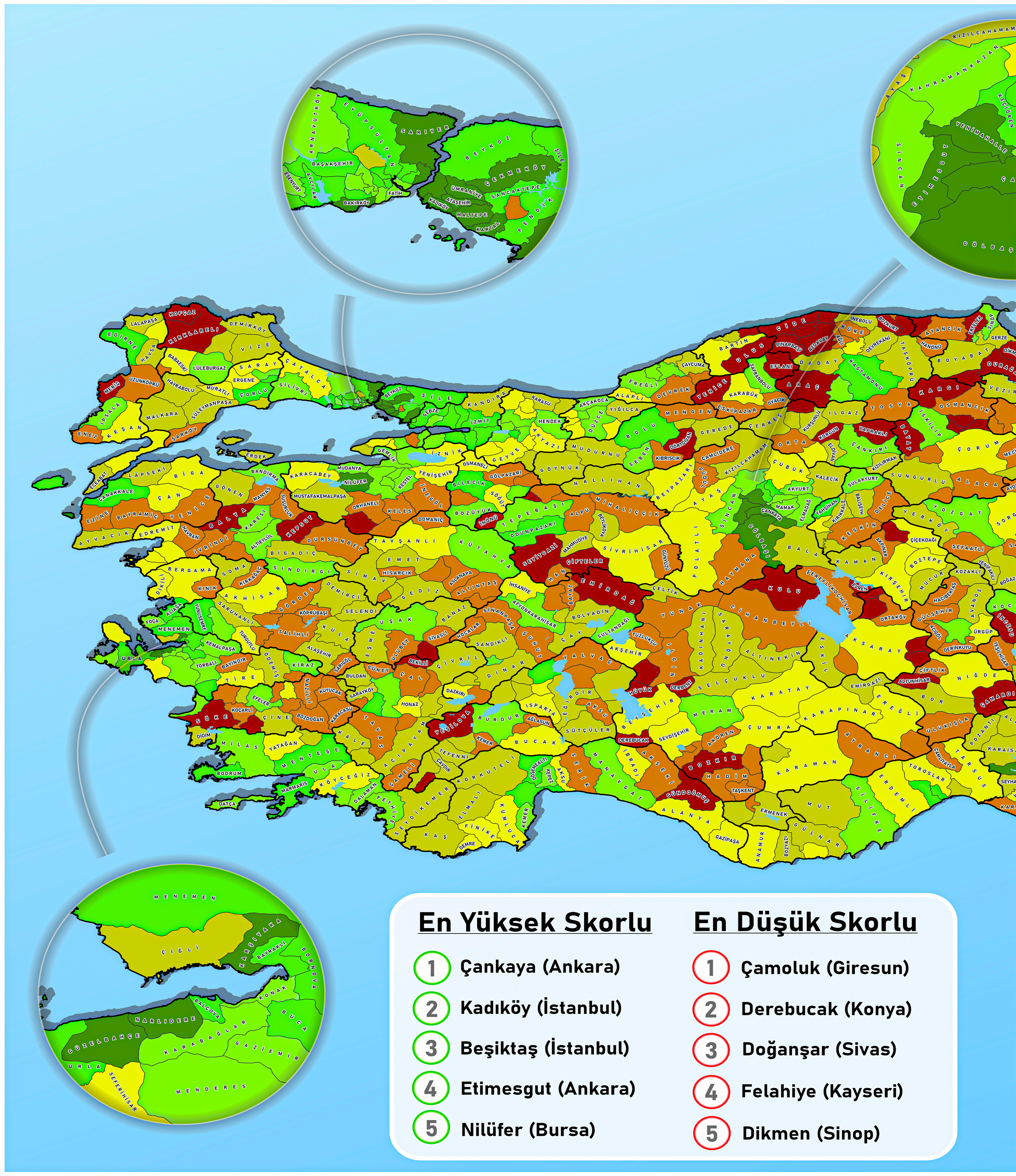 Ortalama SES skoru en yüksek ilçeler: Çankaya, Kadıköy, Beşiktaş, Etimesgut, Nilüfer, Bakırköy, Güzelbahçe.